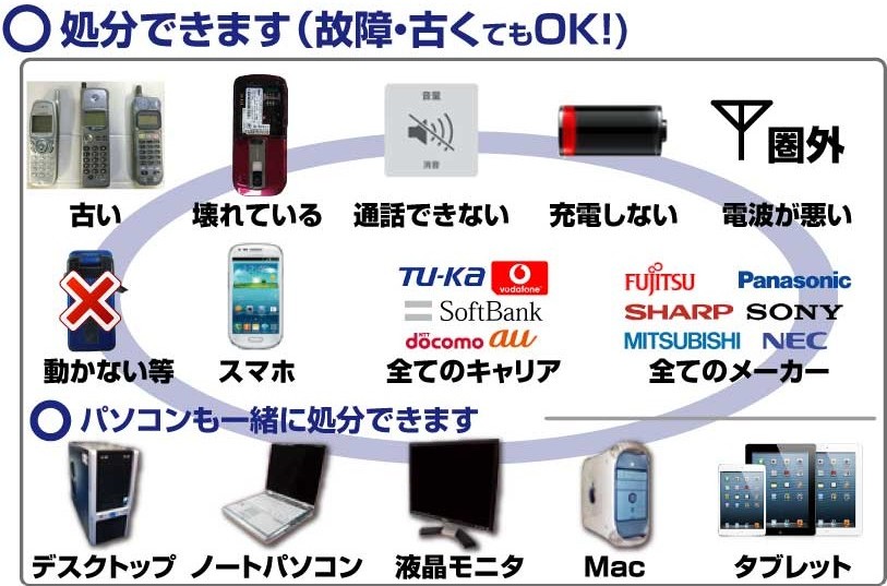 無料処分できるものを画像と名称で紹介します。携帯処分.comは、ご不要の携帯電話(ストレート型、フリップ型、スライド型)をお引取します。キャリアは不問です。(docomo、softbank、au、WILLCOM、ワイモバイル、ディズニー・モバイル等)また古い・故障・スマホなども無料で処分いたします。